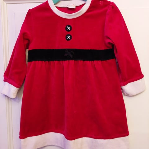 Nydelig hjemmestrikket julekjole str. 86 med knapper på skuldrene.