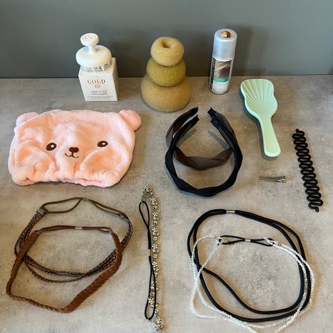 En pakke med diverse produkter og tilbehør til hår: hårbøyle, hårbånd, hårstrikk, hårruller - store, heatless curls, L’Oréal spray mousse, got2be spray mousse, L’Oréal shampoo prøve