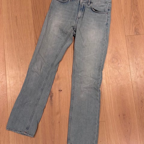 Olabukse fra Ganni, modell 1938 Sheldon Denim, i klassisk jeans farge. Str 26, lengden: 106 (ytre søm). 100% bomull.