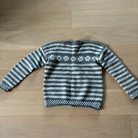 NY UBRUKT STRIKKET ISLENDER STR. 4 ÅR, GRÅ MED BLÅTT MØNSTER SELGES.