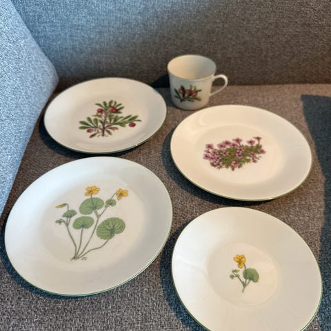 PORSGRUND PORSELENSFABRIKK- FJELL FLORA. - Design Dagny Tande Lid,- 1 meget flott NY kanne med lokk. Høyde ca 14 cm, bredde med hank og tut er 21 cm, veier 535 gram. Stempel under «PORSGRUND, ANKER OG NORWAY».- 1 FLØTESETT (1 mugge og 1 skål), veier 165 gram. og 1 OLJELAMPE, veier 190 gram. ALT ER NYTT! Alle har grønt anker stempel under, og NORWAY. FJELL FLORA ble designet i 1961, dekor 1980. Se mer informasjon under hver del. Fløtesettet kr. 140,- og oljelampen kr. 140.-. kannen kr. 500,-. Alt kan sendes, eller hentes her i Sandfjord, eller avtale henting i Tønsberg på Tolvsrød. Kan også sende med helthjem, koster kr. 82,- inntil 5 kg! Forsikret og med sporing.