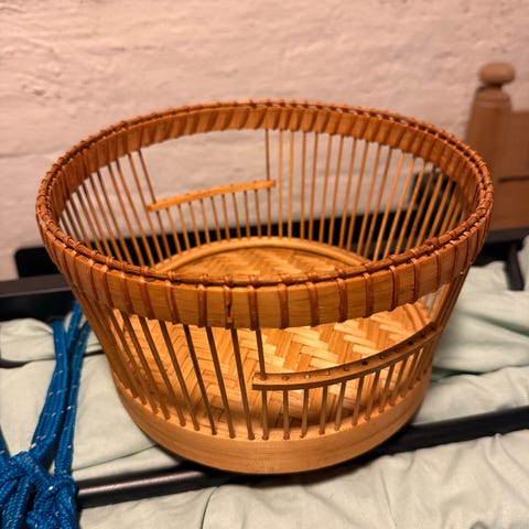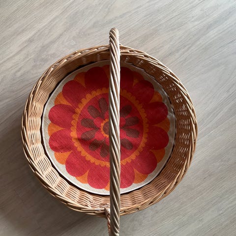 NY søt stor flettet hvit kurv med nydelig jordbærstoff til dorull/dukker/håndkler m.m