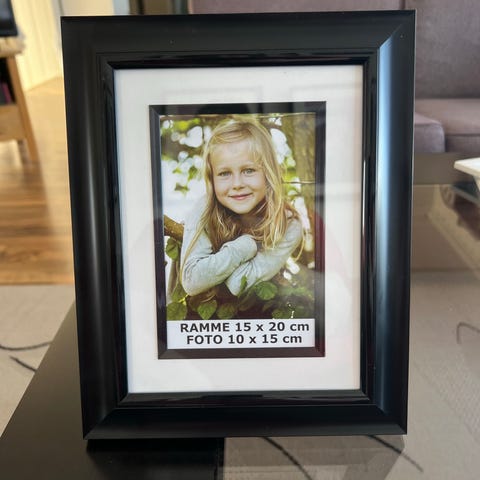 Ramme i plast, ser ut som tre 15,5 x 20,5 cm. Kan brukes med/ uten passepartout