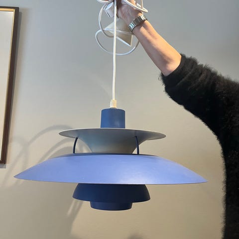 Den er i fin stand og fin. Har ikke oppdaget noen merker på den. Designet av Poul Henningsen på 60 tallet.