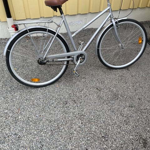 RESERVERT. Pen damesykkel fra den finske sykkelprodusenten Pelago, med åtte gir. Kjøpt brukt på Finn for tre/fire år siden for 4000kr. Nypris rundt 12000,- på disse syklene. Sykkelen trenger en overhaling, og sikkert reperasjoner etter hvert. Den kan sykles på, men jeg synes den virker litt "løs" i forhjulet og noen gir fungerer ikke alltid optimalt i oppoverbakker/ved tung start. Litt rust her og der som avbildet. Selges som den er. Prøvesykles/hentes på Torshov.