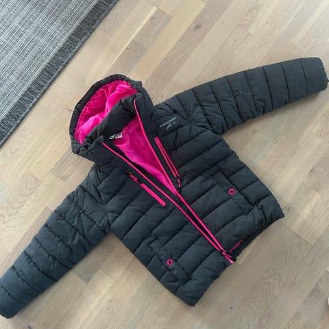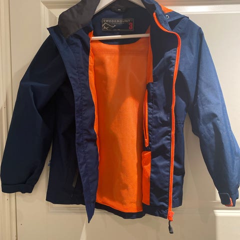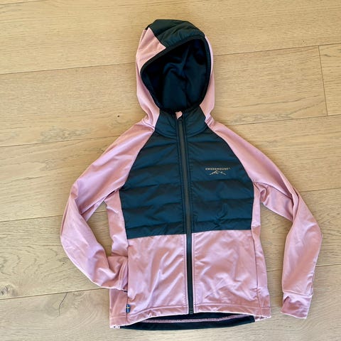 Brukt i slalåmbakken. Jakka har snøstopper rundt midjen.