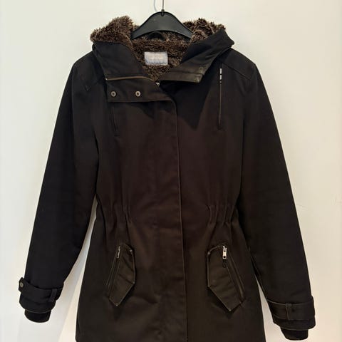 Parkasen har foret og justerbar hette og utenpåliggende gode lommer.