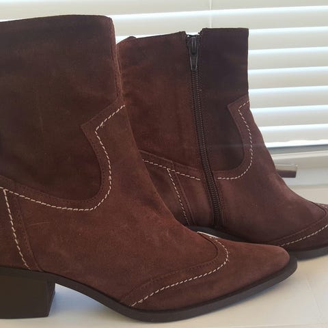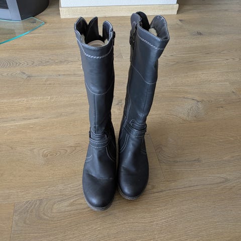 Kjempe kule og fint støvletter i svart semsket skinn, med nagler rundt ankelen. Glidelås i siden. Str 37, men små i str, passer meg som bruker 36. Normal slitasje, men pent brukt