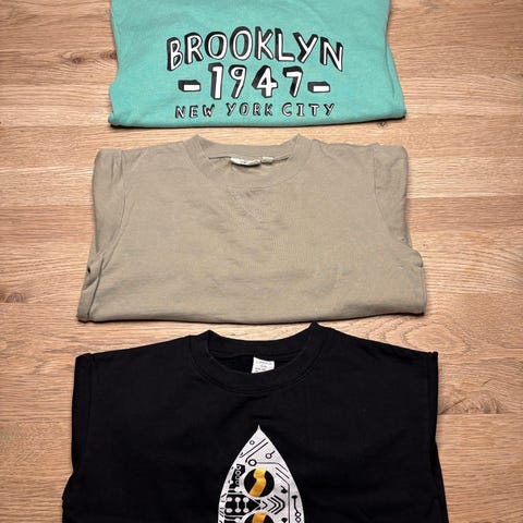To pent brukte t-skjorter. Str og pris under hvert bilde.