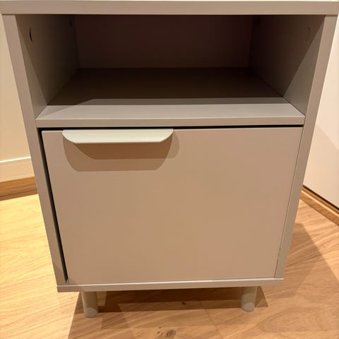 Fin tøykurv og nattbord kjøpt på interiørbutikk.