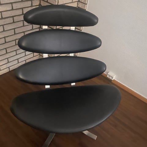Erik Jørgensen Corona lenestol i sort skinn med tilhørende fotskammel selges. Må hentes på adressen.