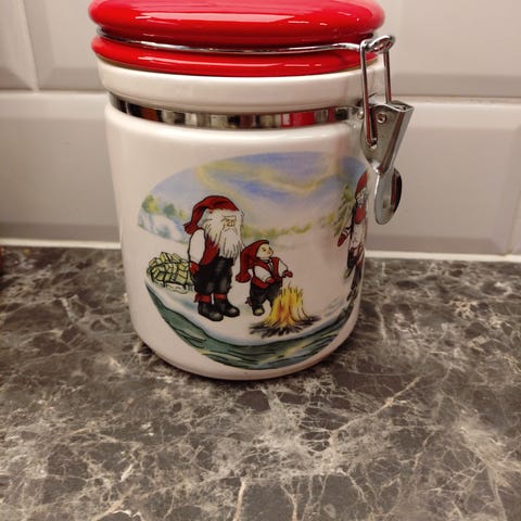 Eldre potteskjuler/ julekrukke formet som en nissesekk. Laget i keramikk. Øverst måler den ca 10,5x9,5cm og den er ca 8,5cm høy. Litt slitasje under kant .