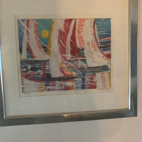 Øivind Sand. Sildesteng i fjorden. Håndkolorert. Innrammet litografi