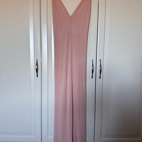 Tettsittende kjole med "ruched back" og split nederst bak. to små spiler i V-en. Brukt 1-2 ganger, men passer ikke lengre.