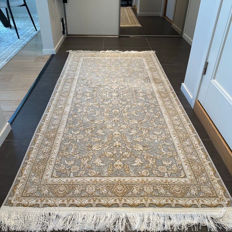 Løper teppe i rektangulær form med orientalsk inspirert mønster. Teppe i hovedsakelig turkis bunnfarge med detaljer i beige, brun, hvit og andre nyanser. Passer godt i gang, korridor eller smale rom. Mønsteret består av svingende bånd og sentrale medaljonger med florale detaljer langs kantene. Materiale og eksakte mål er ikke oppgitt av selger.
