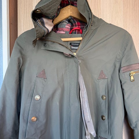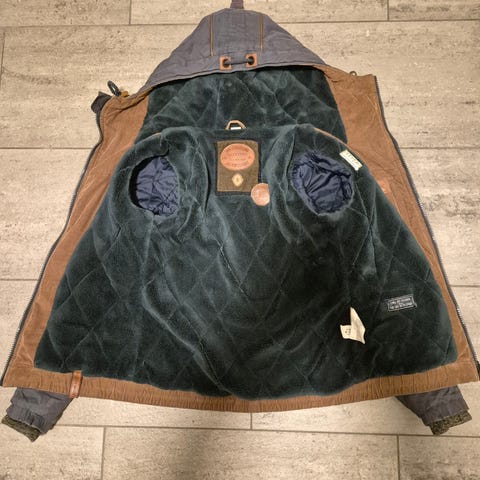 Vintage ytterjakke fra italienske Geo spirit med avtagbar innervest i gåsedun. Stilig og lunt innerfôr med klassisk rutemønster, boblestoff i ermene som gjør den lett å ta av og på. Veldig varm, både med og uten dunvesten. Innvendig snøring i midjen. Italiensk størrelse 46, tilsvarer norsk 40/42 (M). Kan også brukes av mann str S.