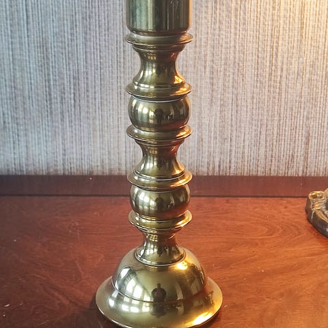 Stor tung messing lysestake 32cm høy i god stand Selges kr 200,-(t11)