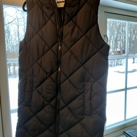 Svart treningsgenser med glidelås i halsen. Strikk på ermene og rundt livet. Refleks bak på ryggen. Pent og lite brukt, ble for liten for meg.