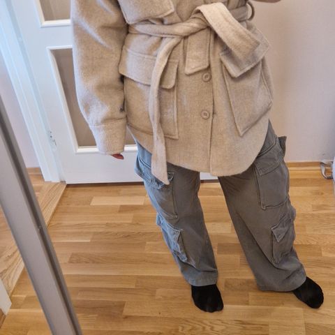 Denne kåpen har en oversized passform. Den har polstrede skuldre og et jakkeslag. Kåpen har enkel knappelukking på framsiden og stoffôr. Ubrukt jakke. Selges grunnet feil størrelse. Kjøpt ny for 1299,