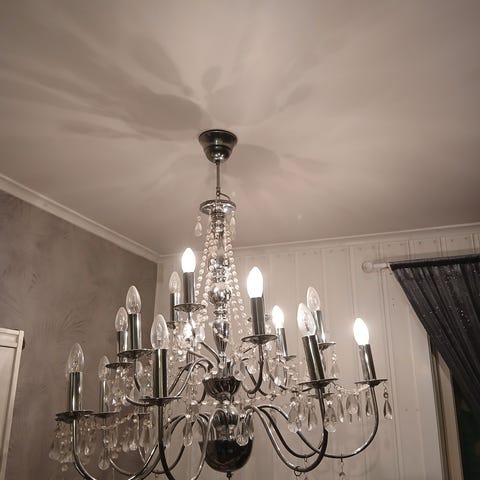 Lampen er i søl farge med krystall pynting, jeg henger bare et par stk for å hvis neste hvordan det ser ut, resten av krystallene følger med.