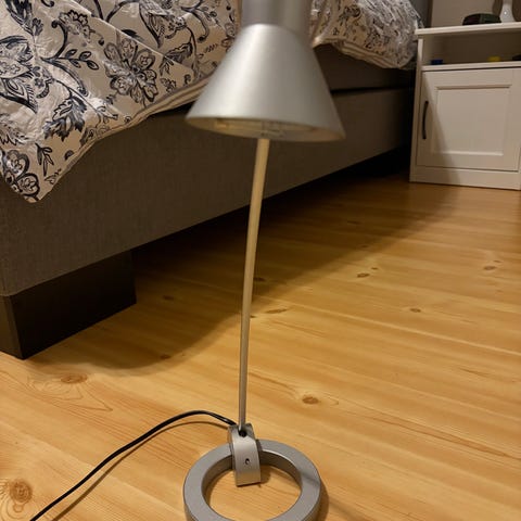 I fin stand. Virker som den skal. Lampe kuppel kan taes av og justeres, er festet med magnet. Høyde ca. 31cm. Kan sendes mot at kjøper betaler frakt. Pakker godt.