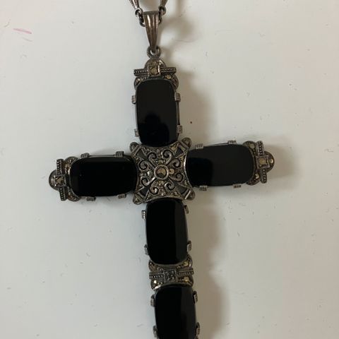 Selger gammelt sølv kors med grønn farge i sølv. Stemplet med 830. 3 cm høyt og 2 cm bredt.