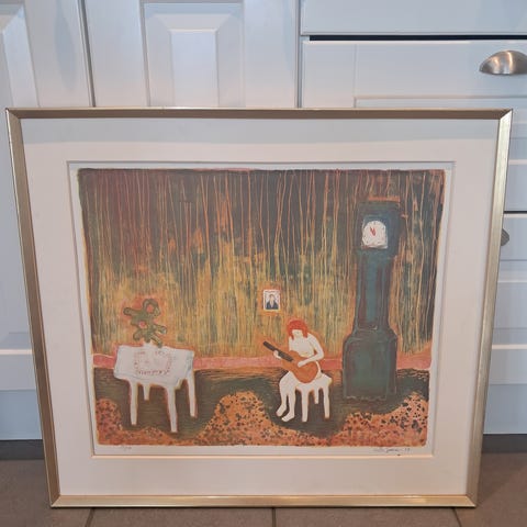 S Iversen. Etsing . Det heter: USTØ og måler 42 x 48 inkl ramme Hbo 600.- . Hansen-Krone, Litografi. 75 x 63 inkl ramme . Hbo kr 1000.-
