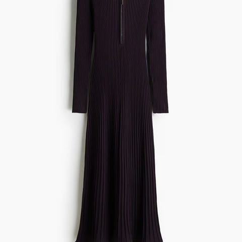 Lukkes med glidelås bak med hempe og en knapp oppi nakken, rekker ca til midt på låret