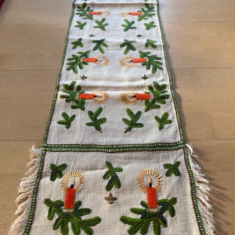 Søt brodert vintage juleløper i tynt stoff. Bunnfargen er lys grønn. Jeg tror denne er ganske gammel. Et ørlite hull, ellers er den i fin stand med forventet bruksslitasje i forhold til alder. 60x18 cm.