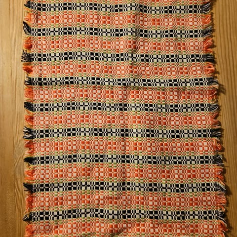 Fin retro løper i strie. Denne er også fin til jul. Den er noe falmet, men fortsatt veldig fin. Ca 106x39 cm.