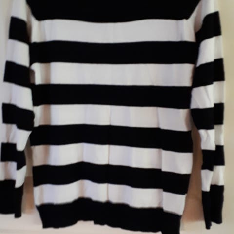 Svart, gul, grå, og grønnglitrende, stripete genser med vid rund hals og trekvart armer. Bred svart (90talls ) ribb på hem og armer. 60% viskose, 19% nylon, 2% metallic.