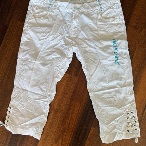 Lyseblå knebukse som går litt over midt på leggen. 2 baklommer og 2 lommer foran. Knyting i livet som har bred stretch linning