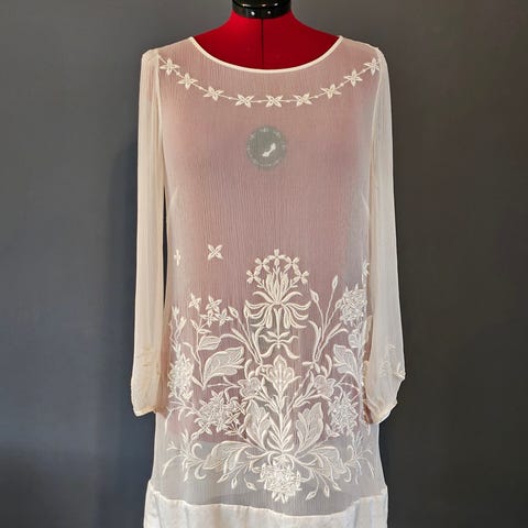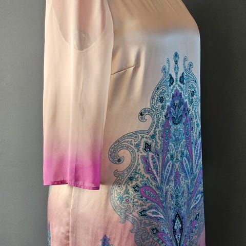 Pen silketopp fra Monsoon. Innfelt bærestykke med knappestolpe og rysjer. Litt vanskelig å få frem, men ta en titt på nærbildene. Glidelås i siden.