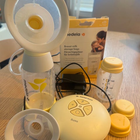 Medela Swing elektrisk brystpumpe med tilbehør inkludert flaske, slanger, brysttrakt, og oppbevaringspose. Batteridrevet med to AA-batterier. Designet for enkel pumping av morsmelk.