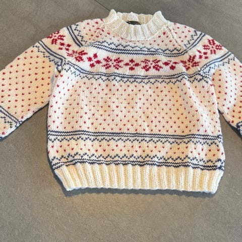 Hjemmestrikket «oversized» genser i cirka størrelse 3 år. Kun strikket med garn som ikke klør.