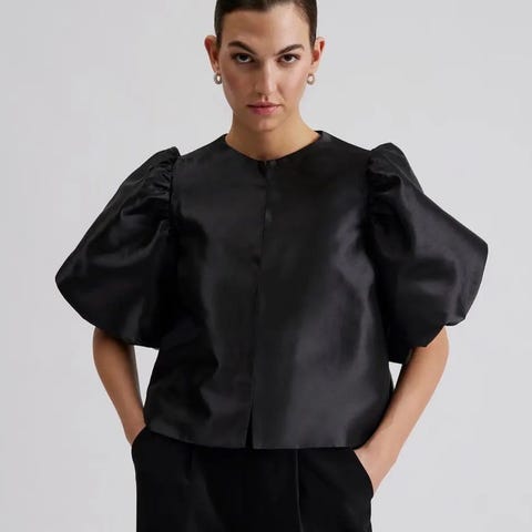 Nydelig topp/bluse med som kan kneppes fremme eller være åpen. A-formet og ballong ermer.