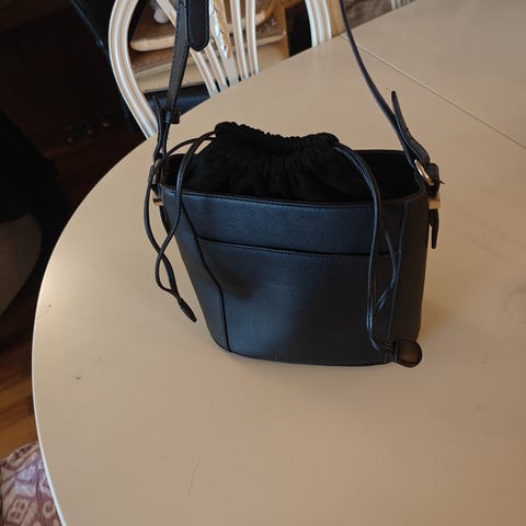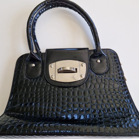 Pent brukt håndveske i sort. Lukkes med glidelås og dekorativ knapp. Vesken er fra Oriflame. Kan også sendes utenom Finn (frakt med PostNord koster 69).