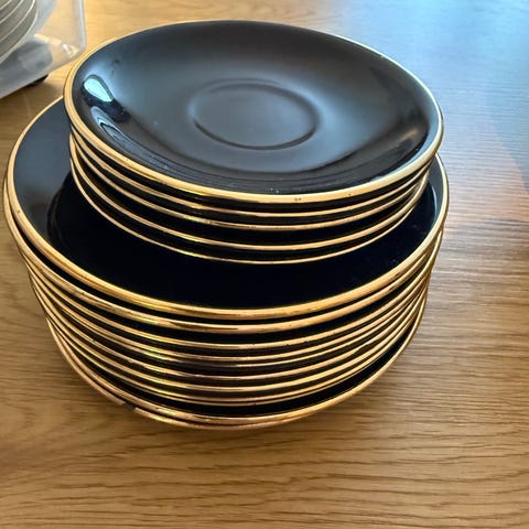 6 asjetter, 6 skåler, 5 kopper, sukkerskål, fløte.