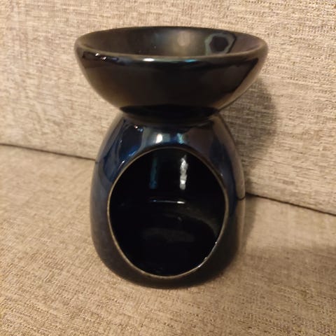 Duftlysestake med duftolje på toppen. Laget i kjeramikk, H 11,5 cm, diameter på toppen 9,5 cm. Flaske med olje (ferskenduft) og dråpeteller medfølger. Alt er ubrukt. Kun kr 150