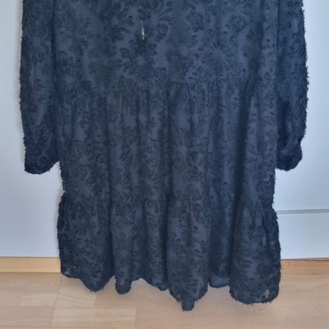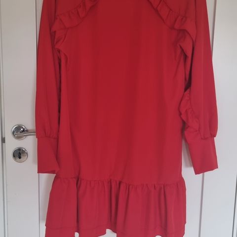Pen rød kjole med volanger på armene.Kan brukes av s og m.Bitttesmå bruksmerker;fremstår som pen kjole.