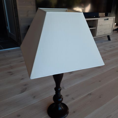 Stor og fin lampe skjerm til bord lampe, seks kantet. Usikker på materialet, men er fast og solid. Noen bruksmerker vil du finne. Liten skade på skjerm, men synes ikke om du ikke studerer den. Svart farge.