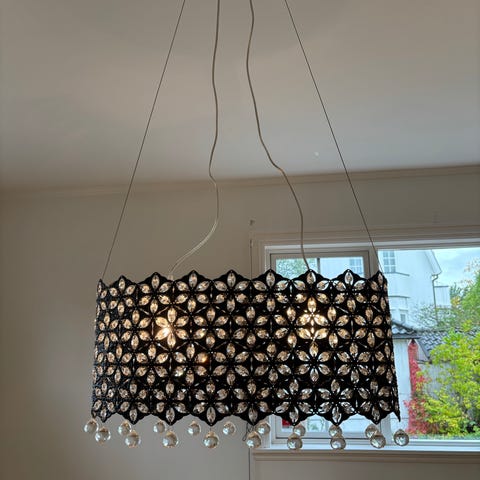 Fin taklampe/lysekrone selges. Med krystaller og fem lyspærer. Enkel å henge opp. Lampen er godt brukt, men har ingen skjemmende defekter og lyser som den skal. Et par av pærene må byttes. Må hentes på Bøler.