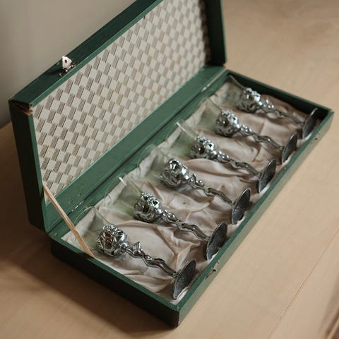 Dette er to håndlagde drammeglass i keramikk. De er signert, men jeg kjenner dessverre ikke signaturen. Det er kanskje noen andre som kjenner den igjen? De to små begrene er svært