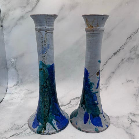 pene. Vakre blå- og grønntoner på kremhvit bunn. De er signert på forsiden. Ingen skår eller nagg. Høyde: 6,5 cm. Diameter åpning: 3 cm. Diameter under: 3,5 cm. Samlet vekt: 97 g.