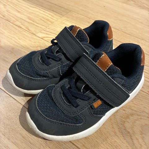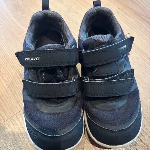 Skoene fremstår som nye på oversiden, mens sålen er blitt grå i fargen etter trakking på asfalt, se bilder.