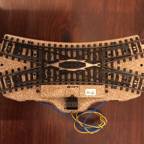 Her har du muligheten til å komplettere/bygge ut banen din med et elektrisk kryss. Sporskiftet virker utmerket. Lyser og skifter greit. Ellers ubetydelige bruksspor, noe støvete og skitten, kan også ha noe kortere ledninger, lim og fargerester. Uten eske.