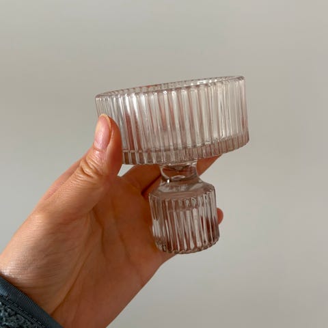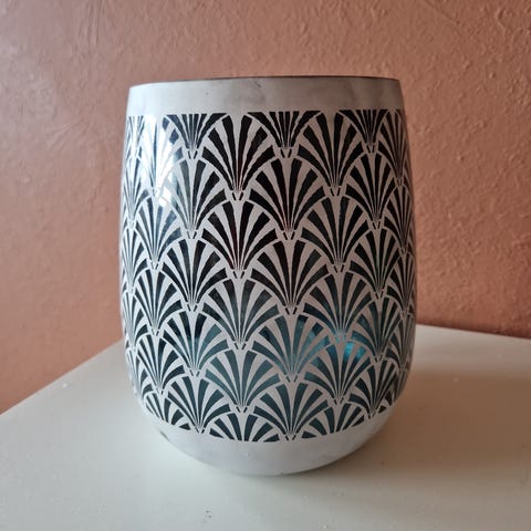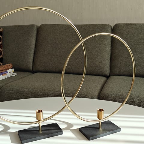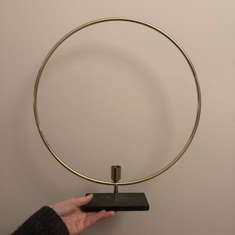 Stearinlysholder / lysestake i form av en messingring på svart metallfot