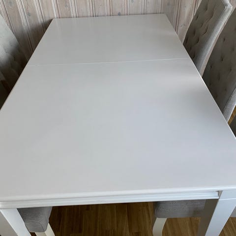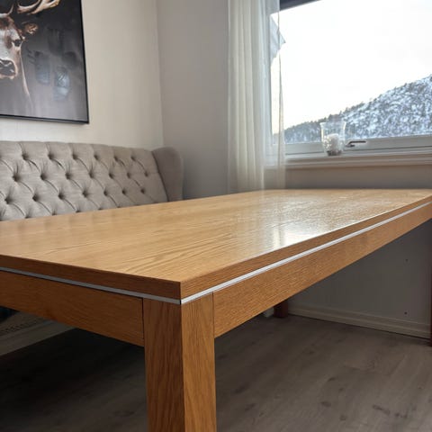 Solid spisebord. Mål: Lengde 147 cm. Bredde: 100 cm. Leveres med tilleggsplate (plasseres i midten av bordet). Mål med tilleggsplate: 147 - 147.