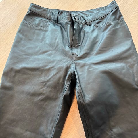En stilig coated bukse i sort med strikk i livet og nederst på beina. Lun og god på vinter og har stretch i stoffet. Fin passform men noe stor i størrelsen.. passer godt en vanlig medium strørrelse. Kun brukt en gang eller 2 og ser helt ny ut. Ny pris 600,-