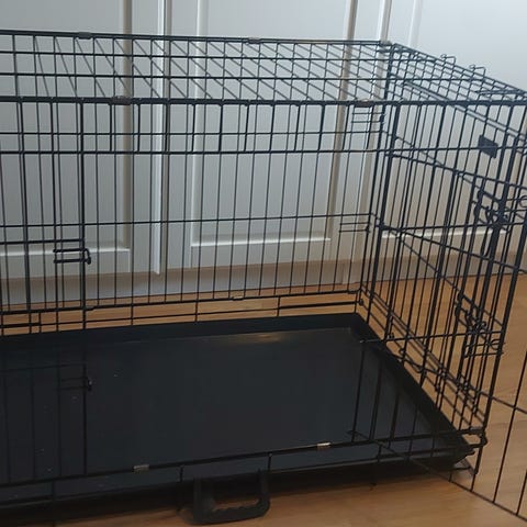 br.58,d.92,h.66. Buret er skrått, slik at det passer inn i bagasjerommet. 2 dører som kan åpnes.